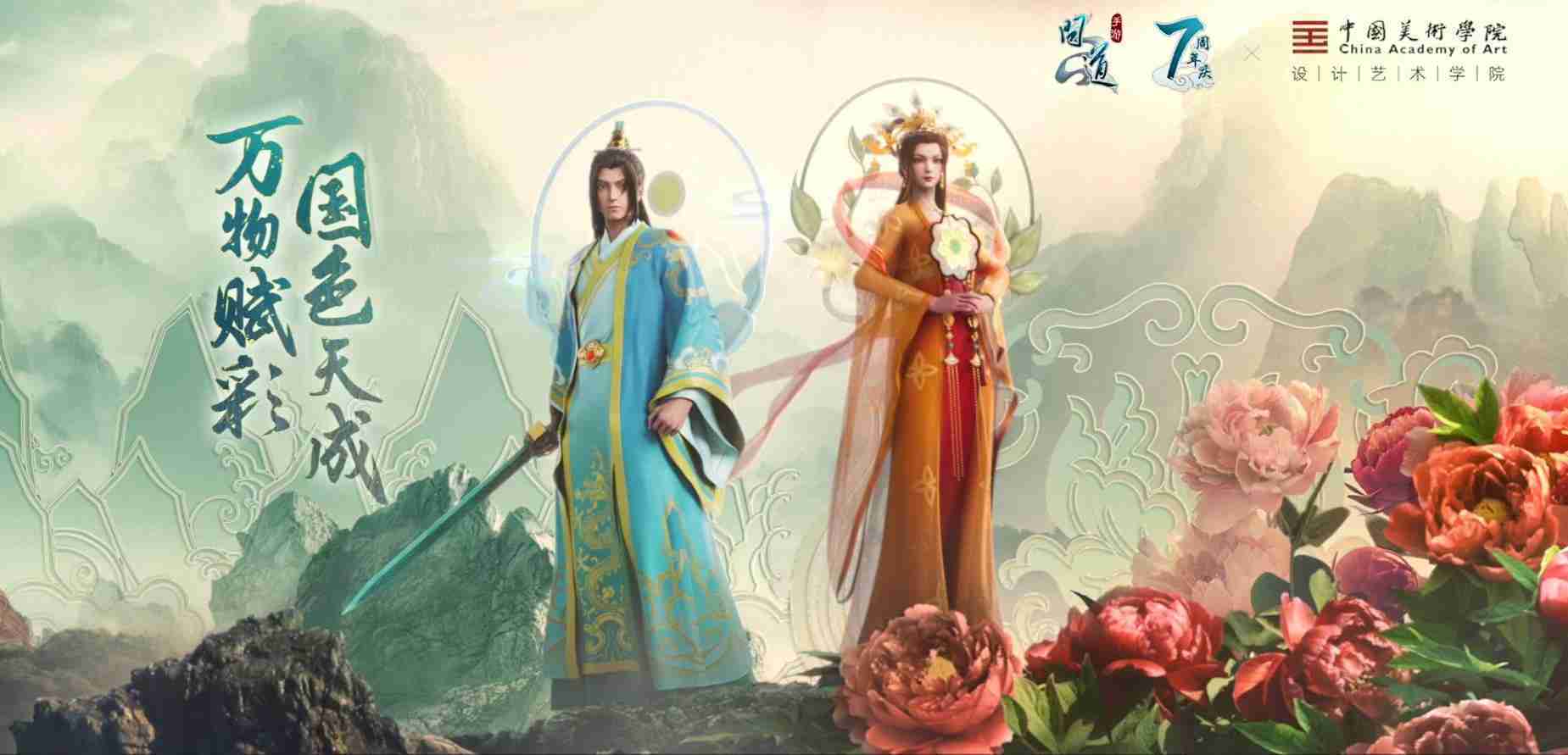 2023年4月,,,《问道手游》联动中国美术学院,,在游戏中融合了中国历史上不同时期的文化元素,,,,打造了“山河万象”与“凤鸣九霄”的国风时装。。。在色彩配置方面,,,创作团队基于对游戏角色特性的分析提取相应的文化内涵,,,,从每一种色彩的色相、、、、指代事物和情感出发对应角色属性,,选定服装的色彩搭配。。。在纹样设计方面,,,创作团队结合游戏角色自身特殊的造型比例和形态,,,在实际的纹样设计中进行了游戏语境下的活化演绎。。。。男性角色集中使用了如蟒纹、、、、海水江崖纹、、、、如意纹和云气纹等传统纹样元素,,女性角色则吸纳了凤凰纹、、牡丹纹、、卷草缠枝纹等元素,,,,组成以“双凤牡丹纹样”“缠枝牡丹纹”“金玉凤冠头饰”为主要纹样的游戏角色装饰图案系统。。